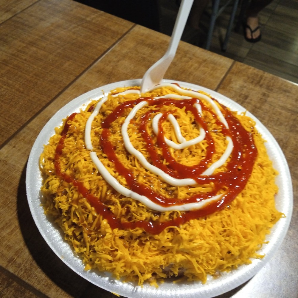 Papas fritas, ketchup, mayonesa, pierna y queso cheddar rayado.